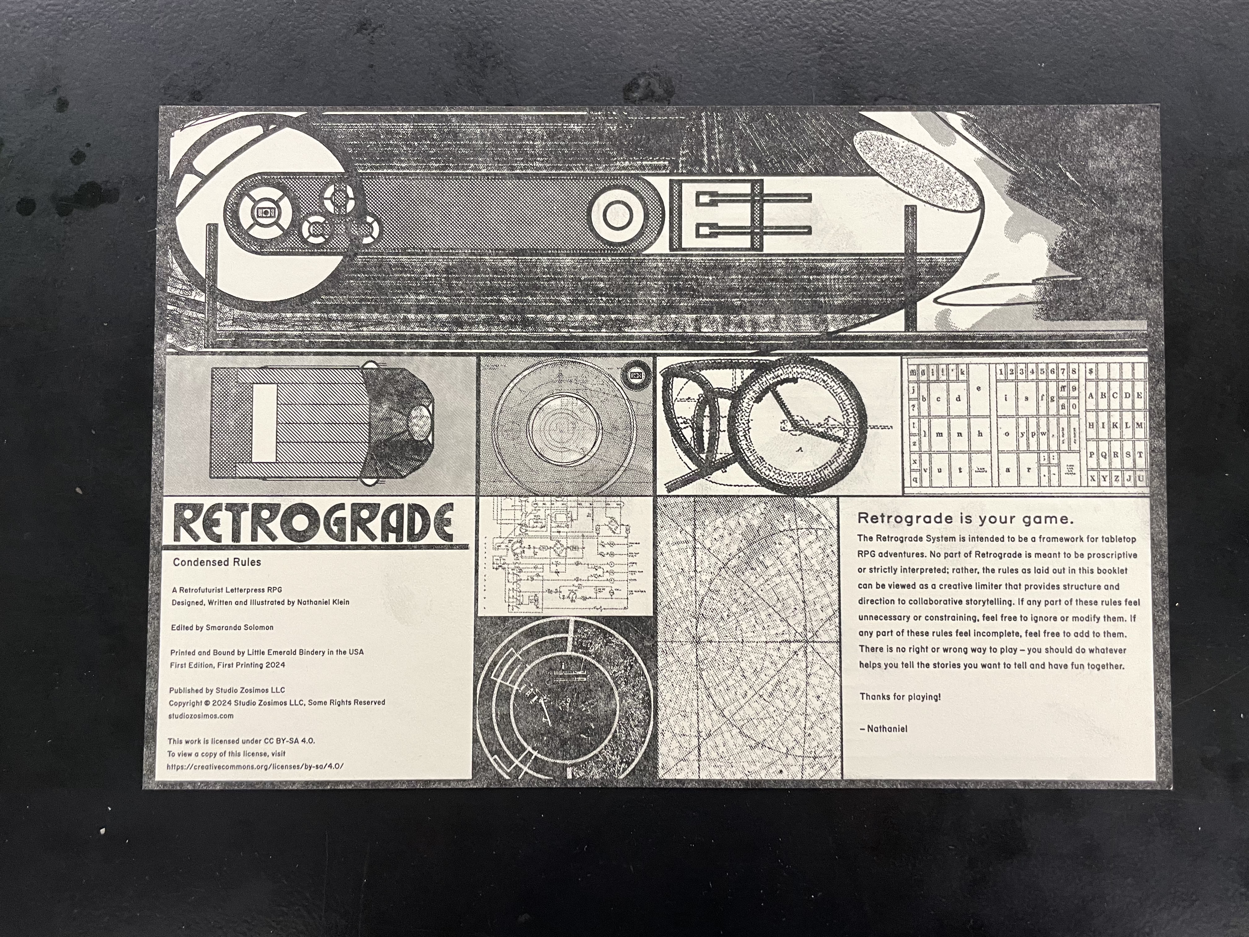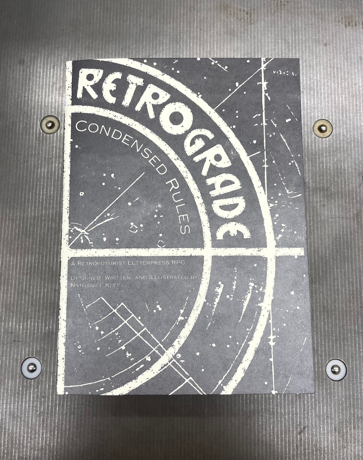 These letterpress experiments spontaneously led to yet another new passion: RPG design. I first played Dungeons & Dragons when I was 8 and properly got involved in the hobby in college. Playing through campaigns with my theatre friends gave me an appreciation for the character-driven, narrative-focused games possible with RPGs. After trying out a few different rules systems, I wanted to design a system that would encourage exactly the kind of gameplay I loved. Letterpress made the idea of creating my own RPG and putting it out into the world feel feasible, and I started designing my ruleset in earnest. Alongside my rules, I developed an analog sci-fi world for my game, built upon an esoteric, alchemical cosmology I’d been developing in my fiction. That world was powered by letterpress, with starships built to be massive printing presses that teleported across the stars, carrying newspapers to distant planets faster than digital information traveling at the speed of light could reach. That world quickly found a name: Retrograde. After some months of experimentation with systems design, writing, playtesting, and illustrating, I was ready to print the first edition of the Retrograde Condensed Rules booklet.