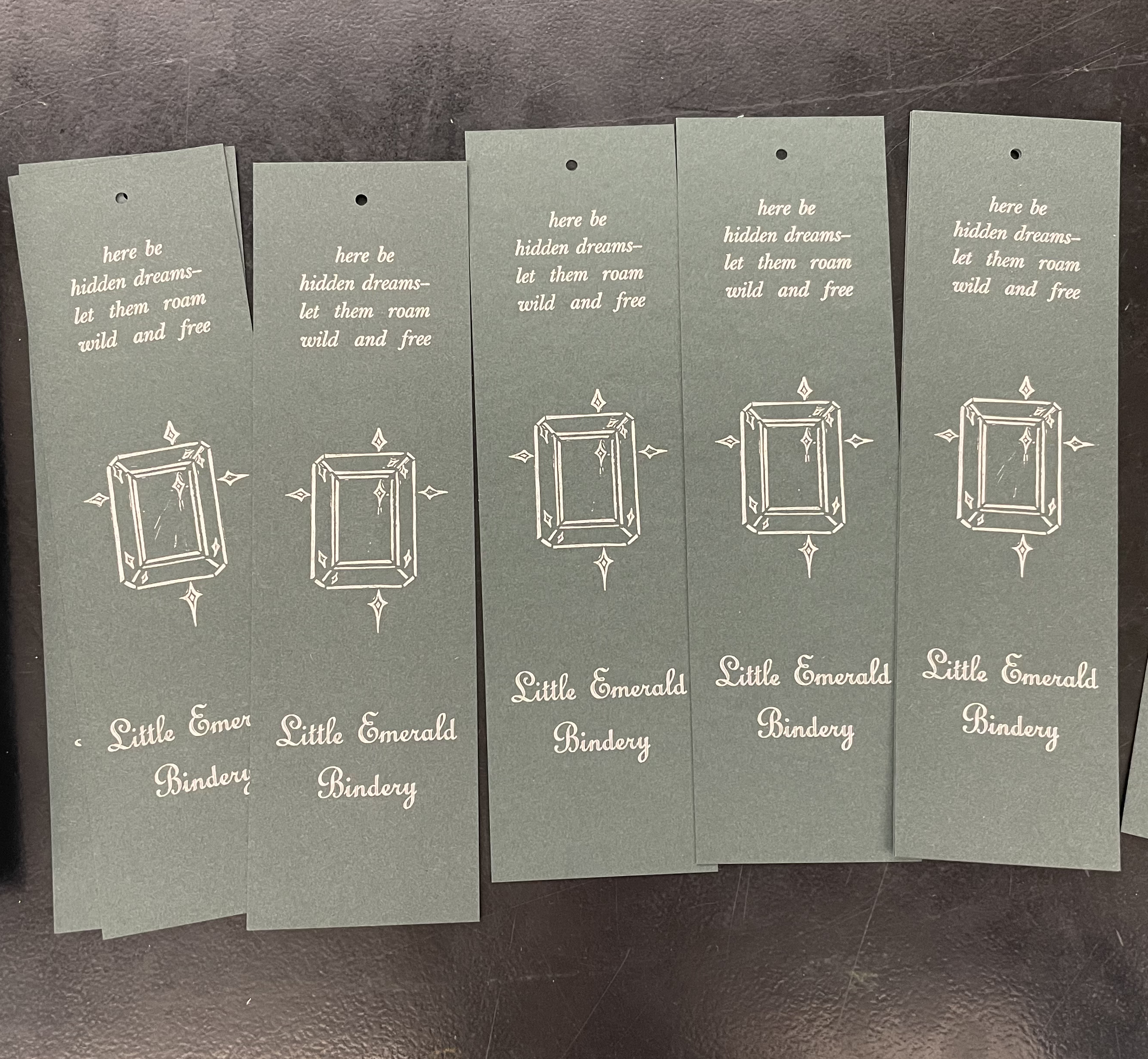 bookmarks for Little Emerald Bindery, my partner and I’s bookbinding business