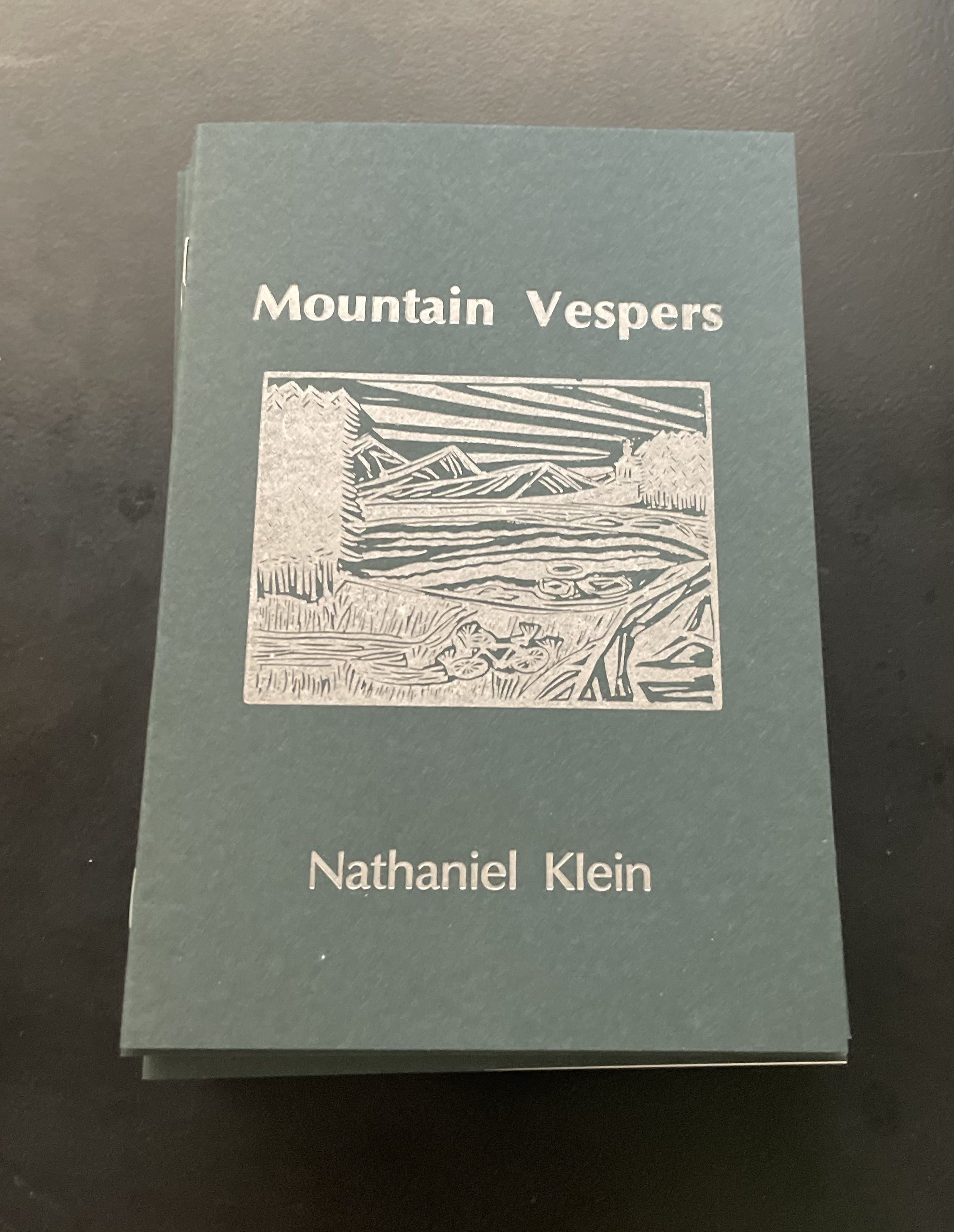 Mountain Vespers, a short story of mine printed with a letterpress cover featuring a linocut illustration.