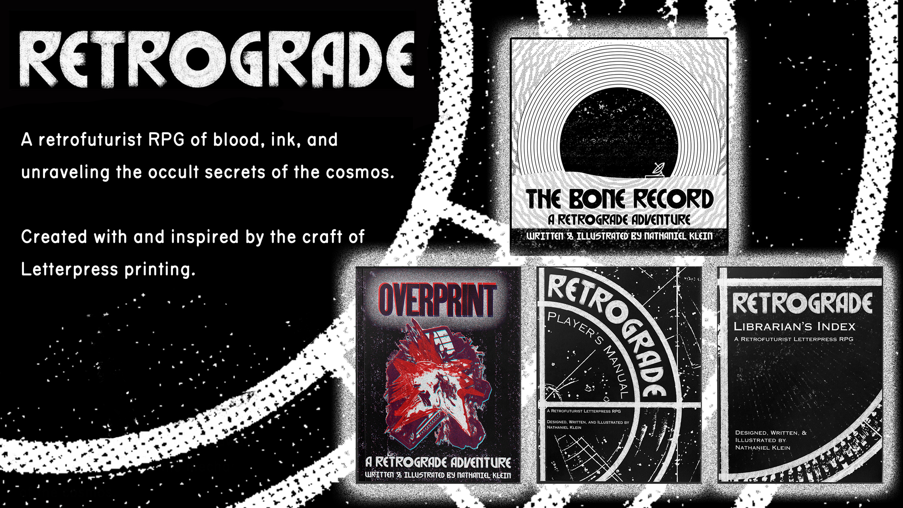 Last February, I undertook the first steps in turning my interests for printmaking and RPGs from a passion to a vocation: I illustrated and bound Panoply Press’s Bad Trips, a cryptid-hunting RPG launched through Kickstarter’s Zine Quest promotion. The idea for Retrograde had been simmering in my head for a good half a year prior, but playing a part in the creation of Bad Trips proved that making my own games and creating beautiful physical expressions of them was not only an actionable goal, but an invigorating creative challenge that would allow me to tell stories that inspired me in a way that was accessible to others. I began laying the groundwork for Retrograde’s creation with an eye toward the next year’s Zine Quest, and now with February just around the corner, I’m immensely excited to share where that journey has taken me.