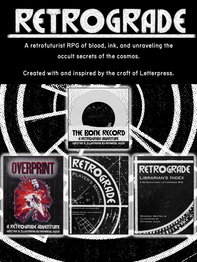 In Boulder, Colorado, in the summer of 2023, the idea for what would become Retrograde began to take shape. I was eager to continue pursuing my passion for printmaking, and when I discovered my local college offered a letterpress course, my mind immediately spun with the possibilities letterpress would open up for me. I had always wanted to design an RPG, and letterpress could be both a physical vessel for my games and a compelling inspiration for them.