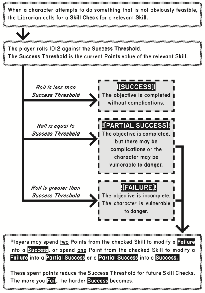 Eventually, however, you will run out of points – seeing your skills tick down heightens the tension of play, and deciding whether or not to spend points adds an element of strategic decision-making. This is especially true if your points in a critical skill are depleted – you’ll have the risky choice between failing the check or spending your hit points.
