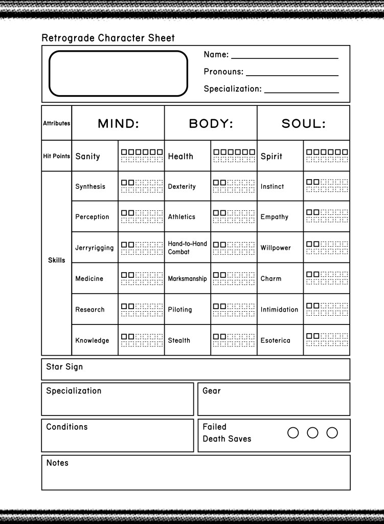 The central mechanic of the Retrograde System works exactly how I hoped it would. A character’s skills serving as both the success threshold for making skill checks and a resource pool they can spend to modify those checks allows for strategic play and critical high-stakes moments where a character’s fate is decided by the roll of the dice.